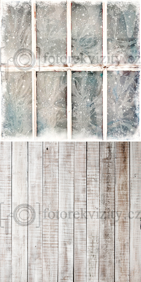 Vinylové fotopozadí spojené s fotopodlahou - Zamrzlé okno a dřevěná podlaha