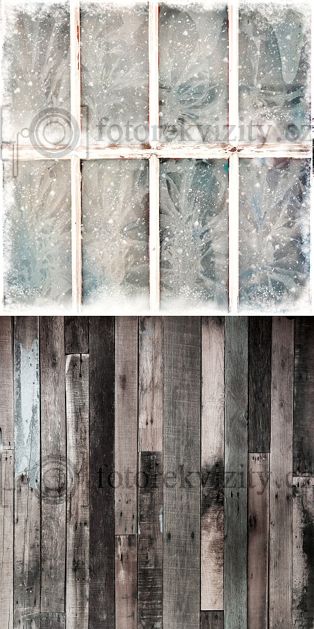 Vinylové fotopozadí spojené s fotopodlahou - Zamrzlé okno a dřevěná podlaha