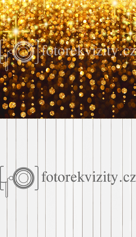 Vinylové fotopozadí spojené s fotopodlahou - dřevěná podlaha a zlaté třpytky - vhodné na vánoční focení