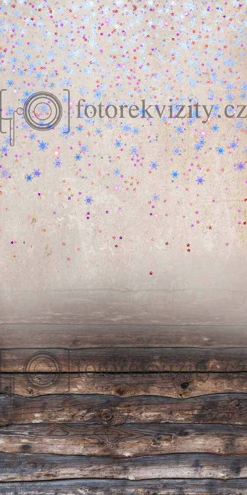 Vinylové fotopozadí spojené s fotopodlahou - Dřevěná podlaha a vločky