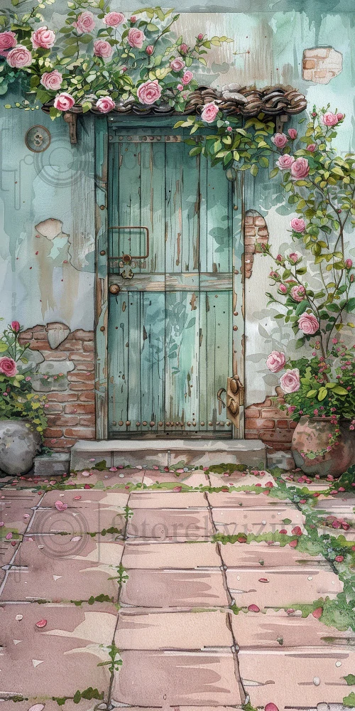 Vinylové fotopozadí spojené s fotopodlahou - staré dveře, růže, květy, dům