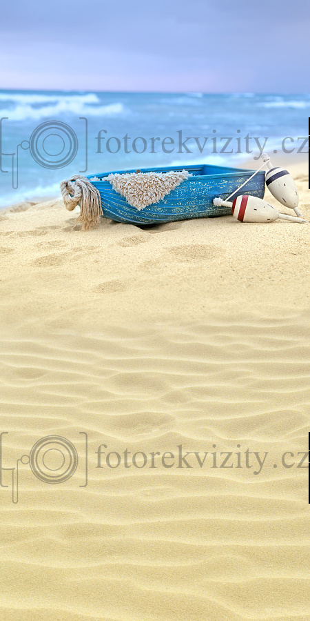 Vinylové fotopozadí spojené s fotopodlahou - Přechodová podlaha a pozadí pláž s loďkou