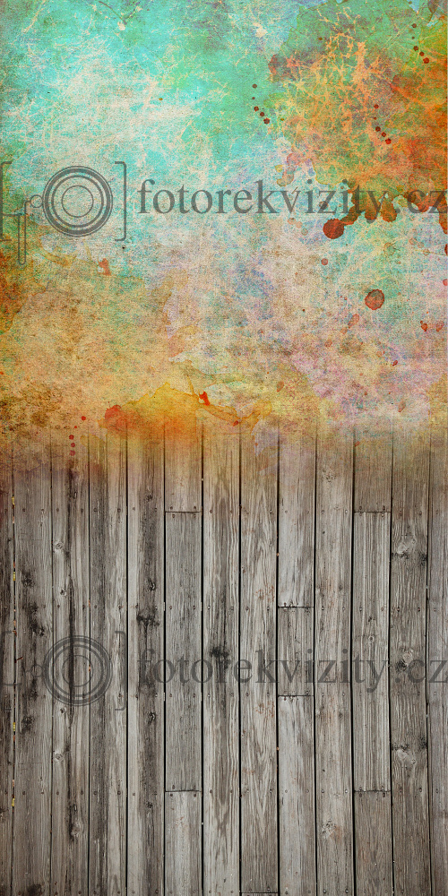 Vinylové fotopozadí spojené s fotopodlahou - Dřevěná podlaha a barevné pozadí