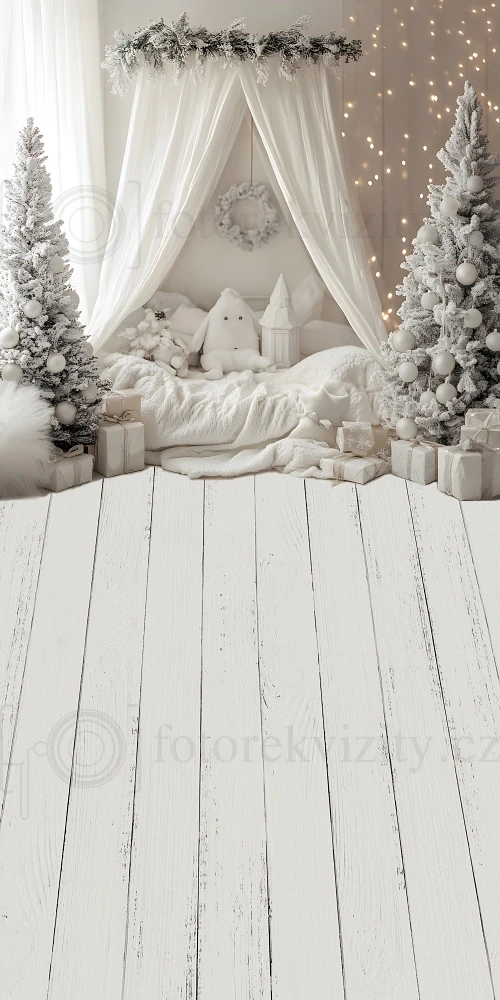 Vinylové fotopozadí spojené s fotopodlahou -- vánoční, světlé, béžové, stromek, pohovka
