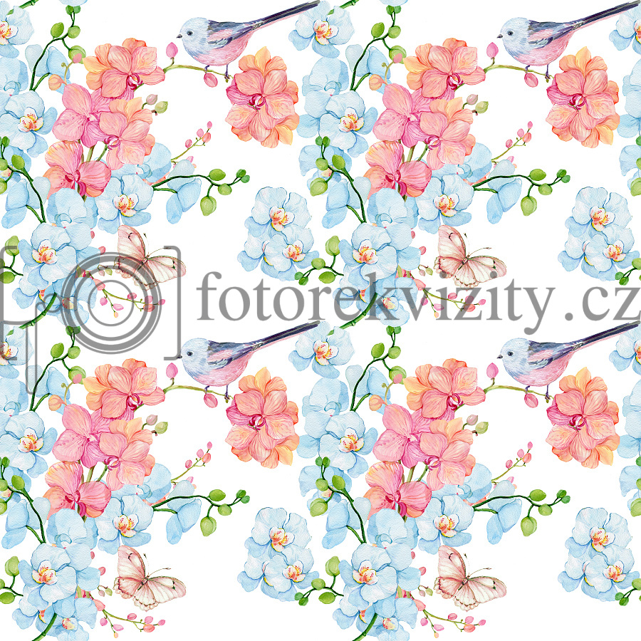 Vinylové fotopozadí - Jaro, květy, orchidej, ptáčci, motýl